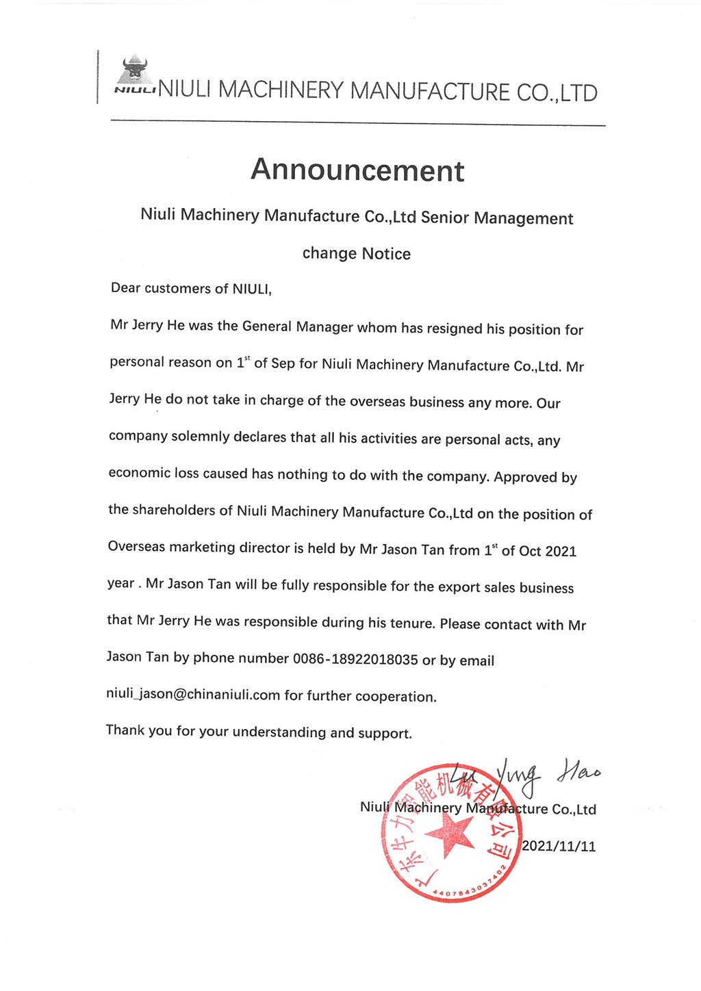 牛力機(jī)械制造有限公司高管變動(dòng)公告