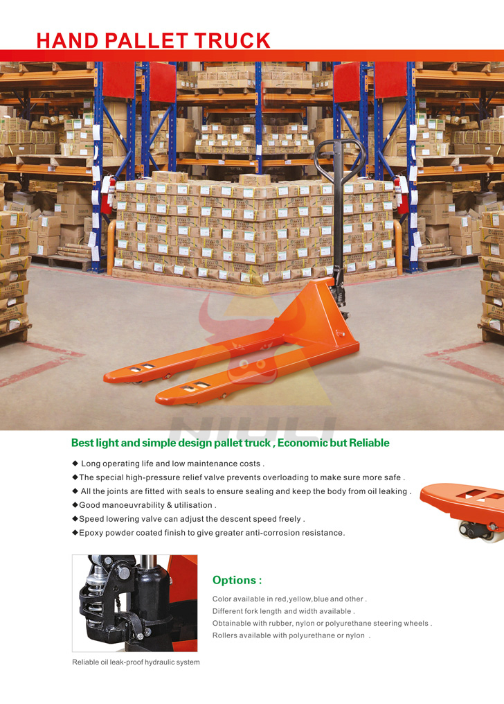 Light – duty hand pallet truck is built to last, with its durable welded steel construction and a high quality, scratch resistant painting finish , Exceptionally strong but light weight steel construction, and self weight of only 65 kg .